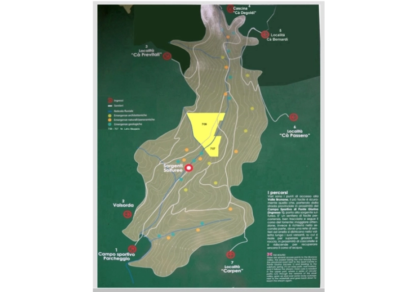 Nella zona centrale della Valle del Brunone (BG), evidenziato in giallo nella mappa, vendesi lotto di circa 15.000 mq. di terreno di bosco ceduo con molti alberi. Possibilità di accesso alla strada che attraversa il bosco, sia a piedi, che tramite mezzi di trasporto agricoli, o autoveicoli 4x4. I punti di accesso sono 7, come indicato nella mappa: 3 al nord, 3 al sud e 1 al centro. Il terreno può essere utilizzato per il pascolo o allevamento di animali, oppure per ricavare legna da ardere. Prezzo euro 15.000 trattabili.